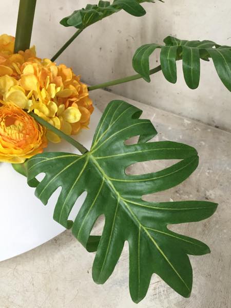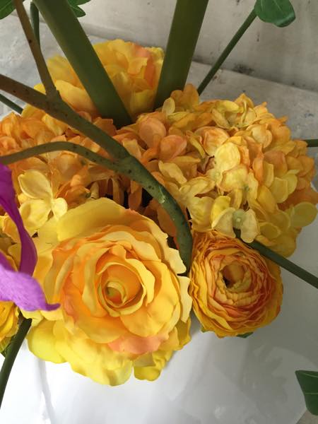 器の口元にある黄色系の花はバラ、あじさい、ラナンキュラスです。かなり発色のいい造花でアレンジ全体を明るくしてくれています。