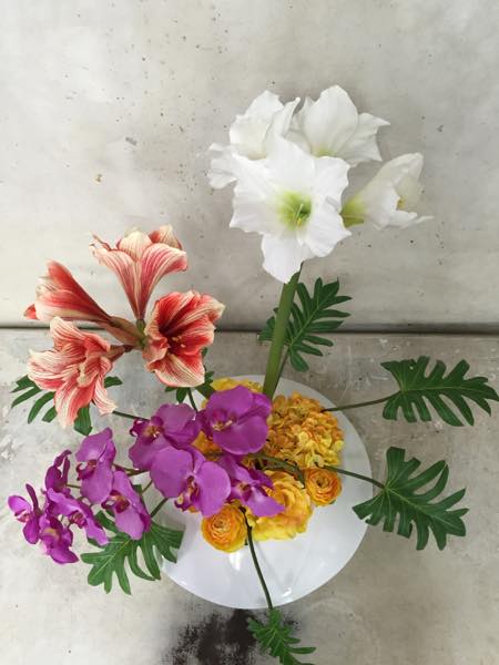 モダンな白い樹脂製の器にアマリリス、コチョウランという豪華な花を組み合わせました。