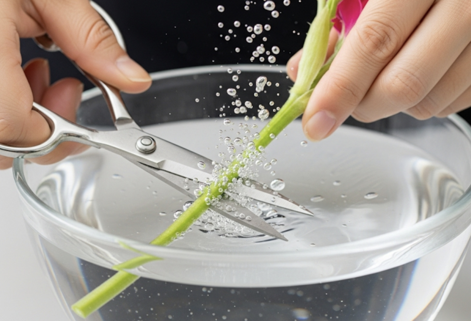 - 最初の水揚げは水中で茎を切る「水切り」が基本