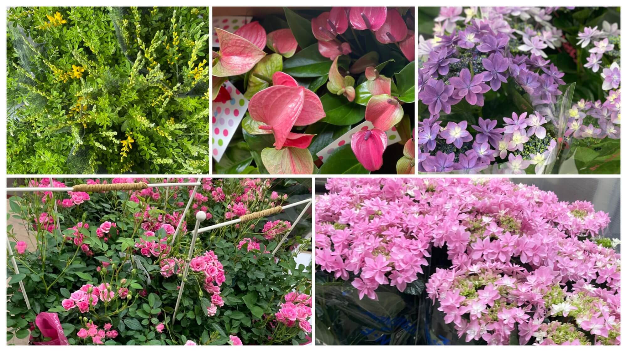 4月6日に入荷した花鉢のお知らせです。上段左からヒメエニシダ、中央はアンスリウムが3品種、左は紫陽花のダンスパーティーハッピー。下段左はミサキという薔薇。右は紫陽花の歌合せです。