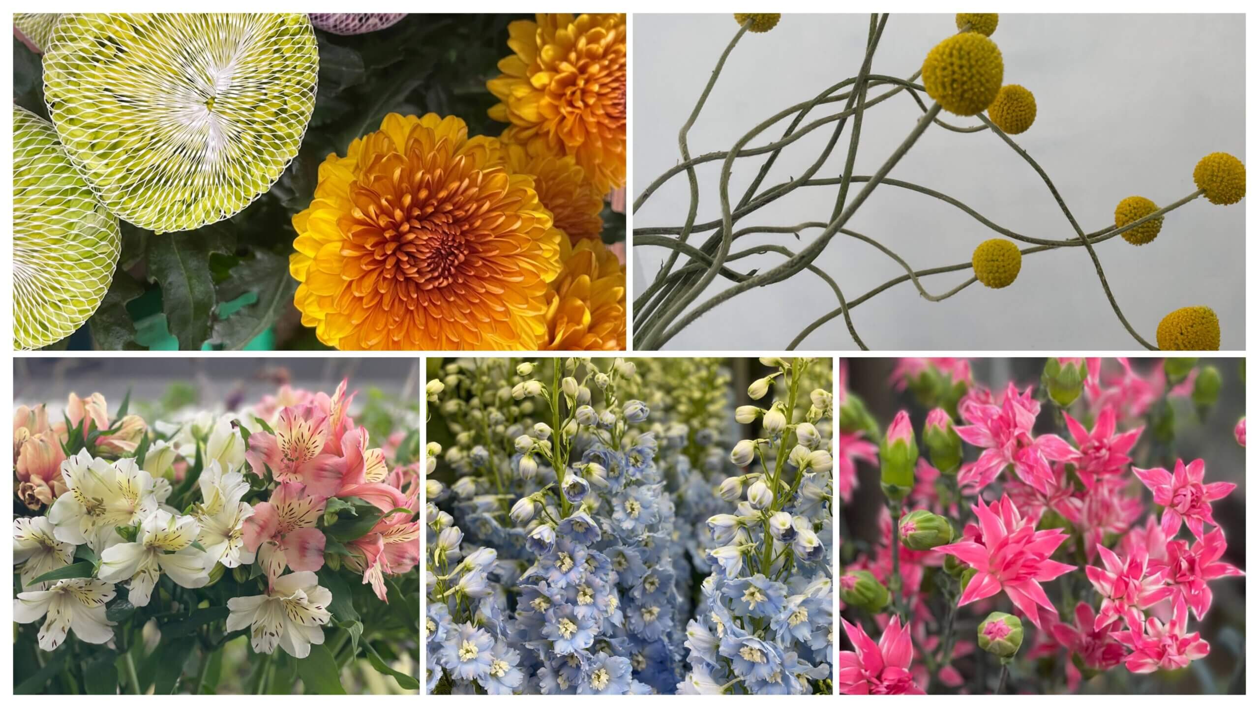 4月8日の切り花入荷のお知らせです。上段左は洋マムです。近年では色々な色、形の洋マムが出回るようになりました。左はクラスペディア。ゴールデンスティック、ドラムスティックとも呼ばれます。今日仕入れたクラスペディアはかなり曲がりまくってます。下段左はアルストロメリア3品種。左に少し見えてるのがミルクティー。白がマッサ、右はピンクパフェです。中央はデルフィニウムのクレスライトブルー。右のピンクはスプレーカーネーションのスターチェリーです。