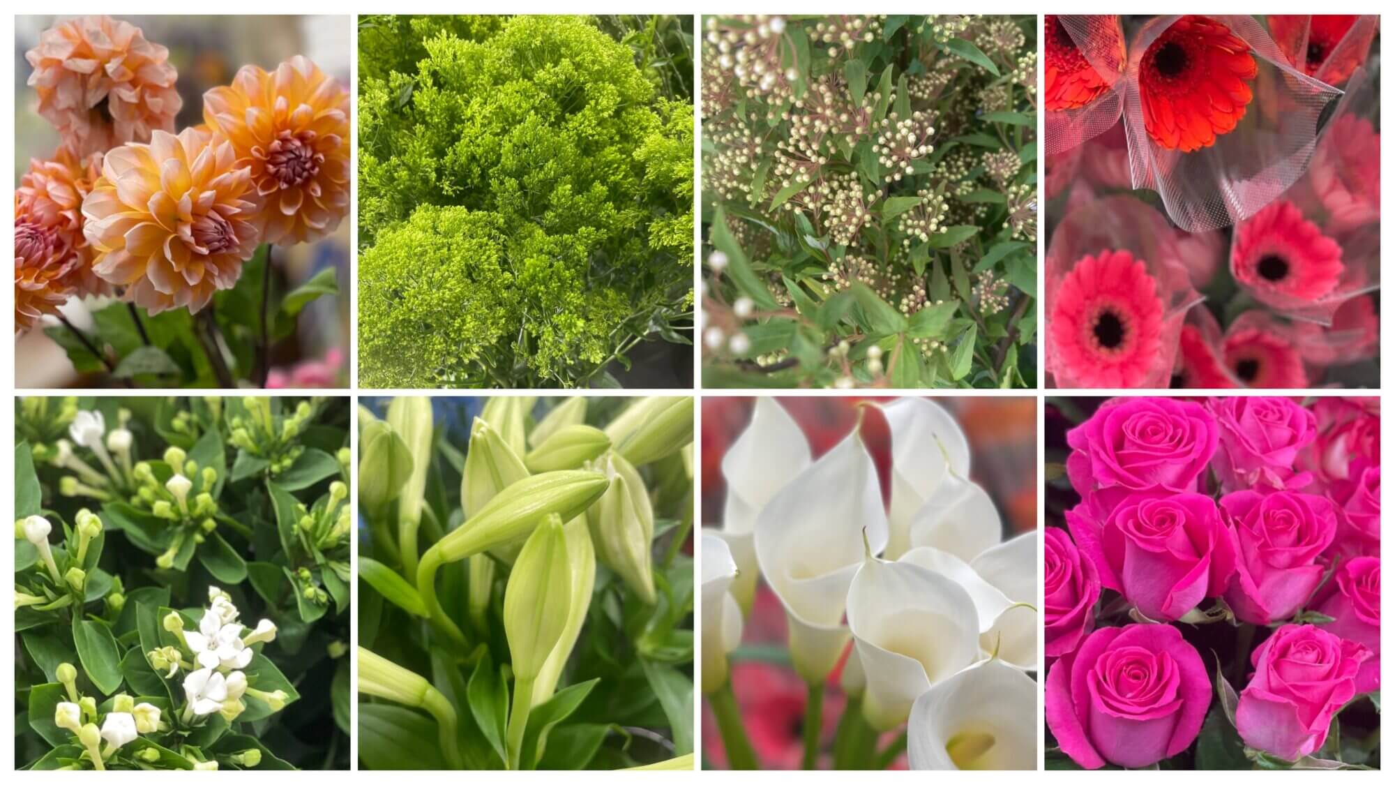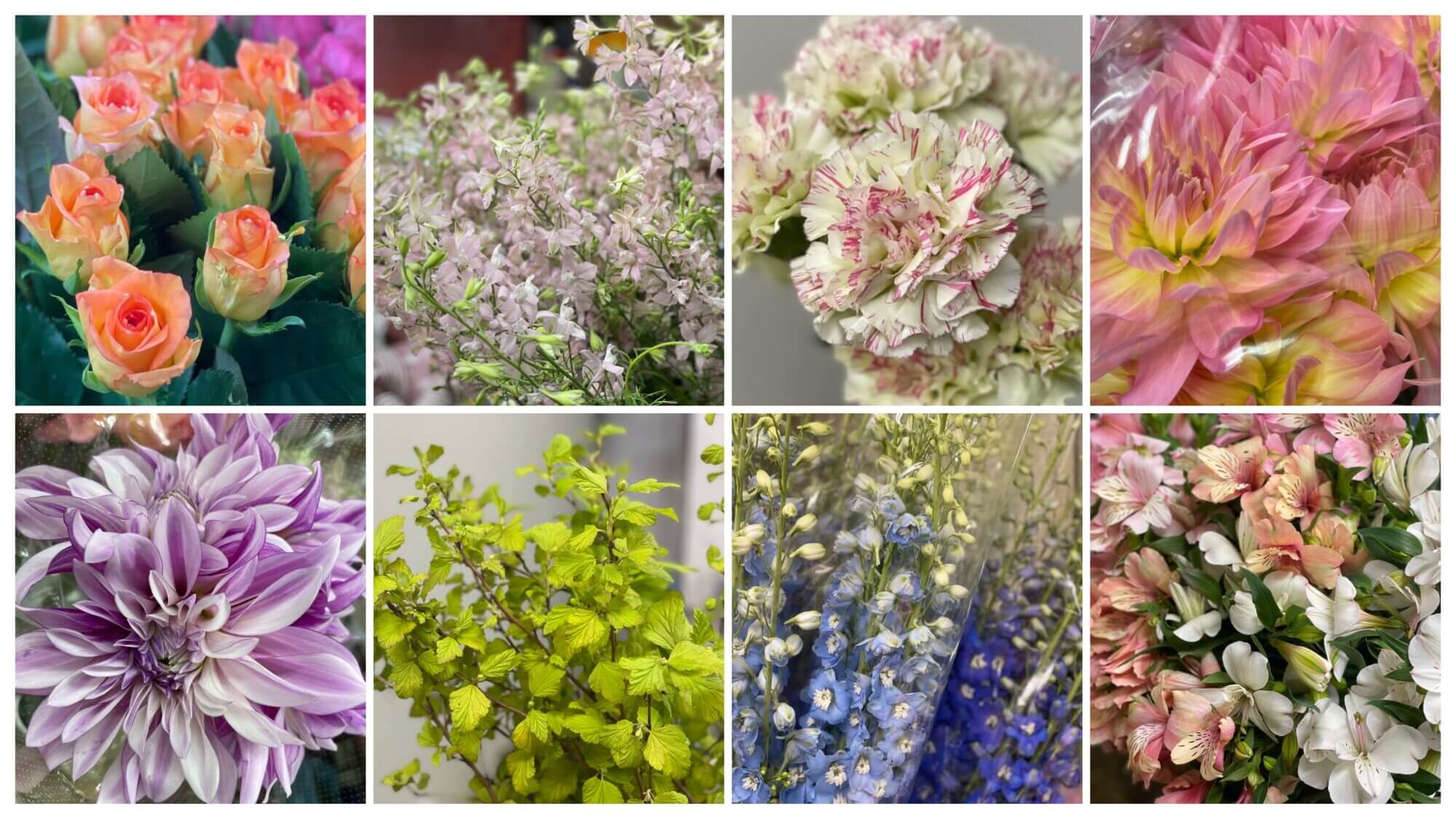 4月15日の切り花入荷のお知らせです。上段左のオレンジのバラはフェスティボ。次はピンクの千鳥草(チドリソウ)。3番目はカーネーションのモチ。最後はダリアのムーンワルツです。下段の左はダリアのノーブルライト。次はアメリカテマリシモツケ。3番目はデルフィニウム。最後はアルストロメリアのホワイトハート、ミルクティー、ピンクパフェです。