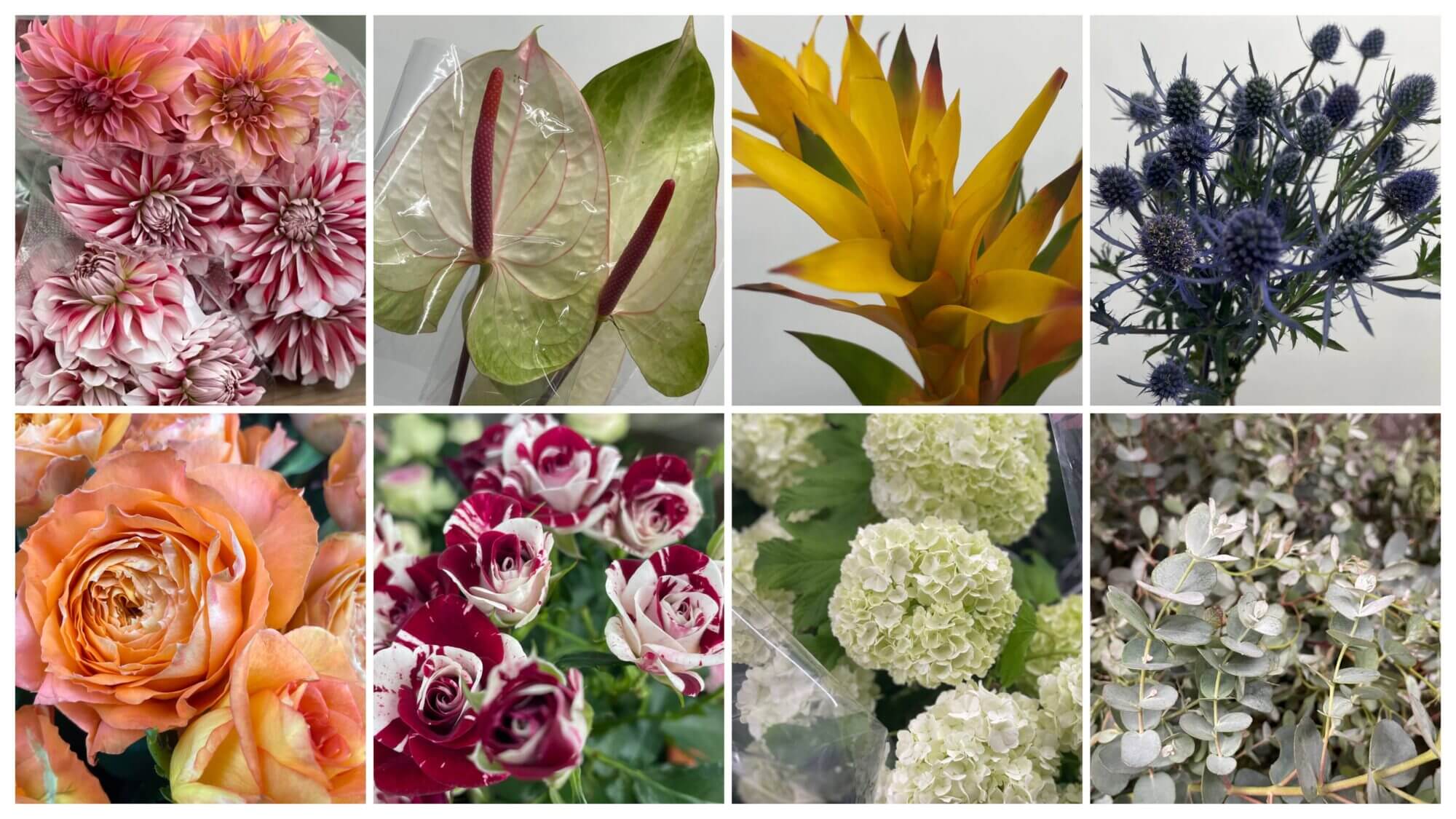 4月18日の切り花入荷のお知らせです。上段左からダリアの上がアンティークロマン、下の赤白が彩り。2番めはアンスリウムのファンタジア。3番目はグズマニア。最後はエリンジウムです。下段左はバラのオレンジロマンティカ。2番めはスプレーバラのスパークリンググラフィティ。3番目はビバーナム・スノーボール。最後はユーカリのグニーです。