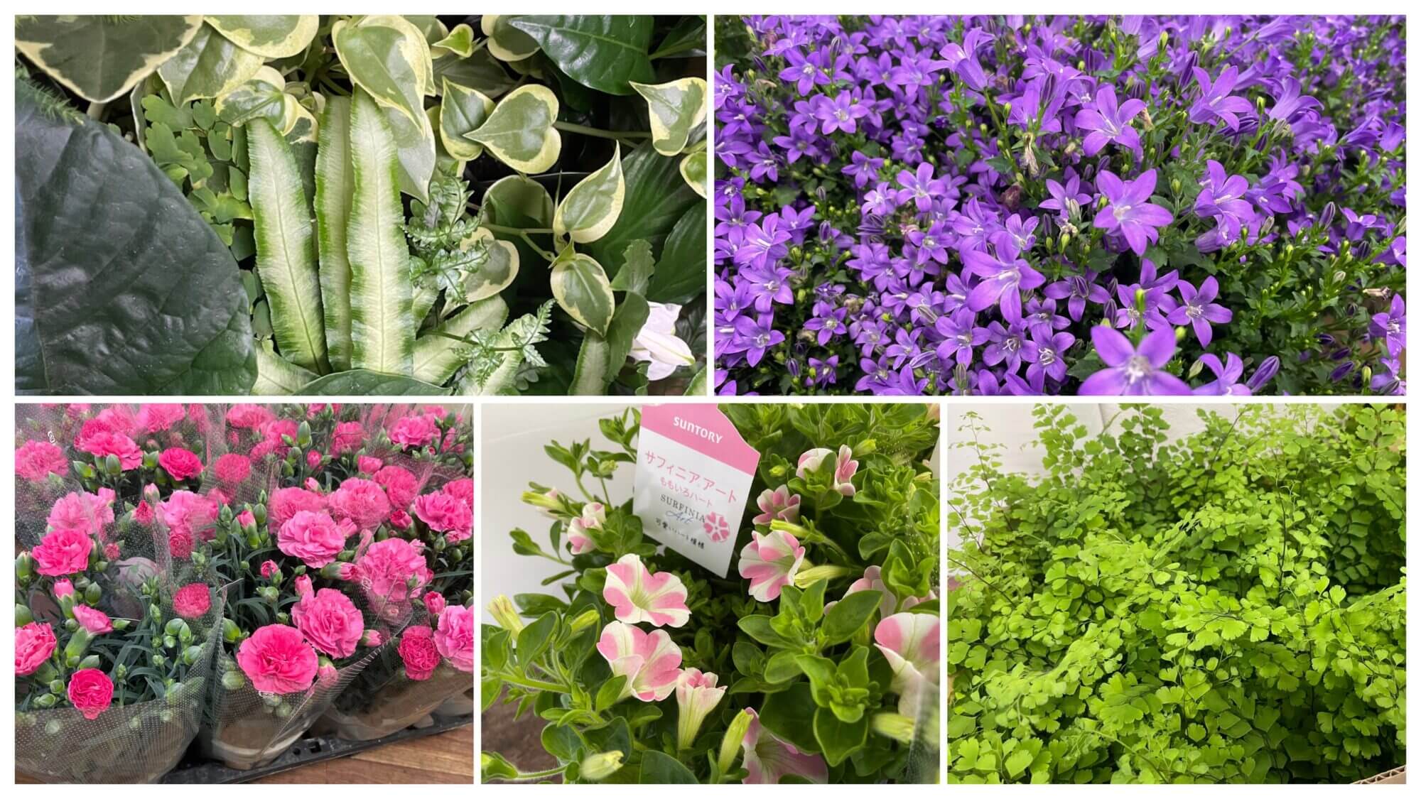 4月27日の鉢物入荷のお知らせです。上段左は観葉植物のいろいろミックスで左はベルフラワーです。下段左はカーネーション、中央はサフィニア、左はアジアンタム。5月8日は母の日ですので来週にはまたカーネーションや花鉢が入荷する予定です。