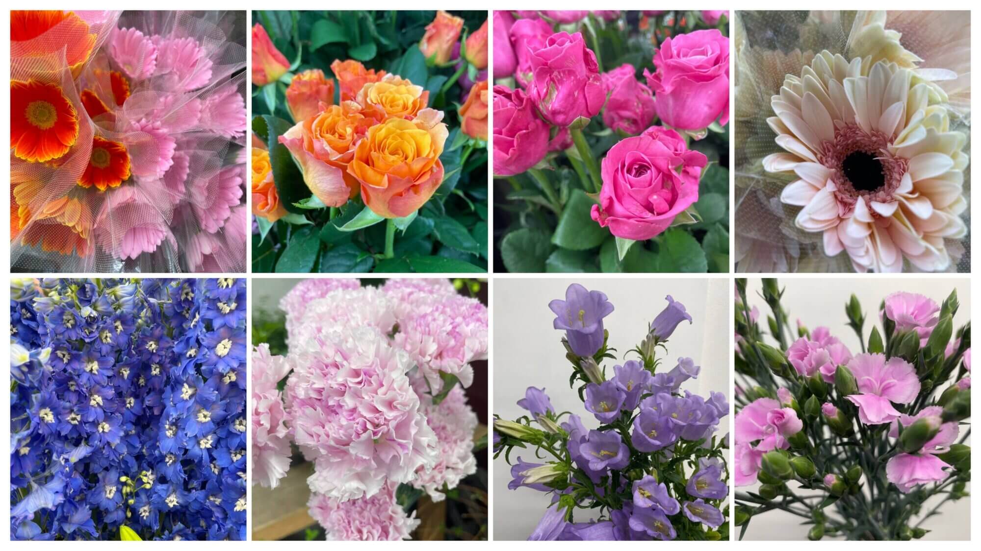 4月29日の切り花入荷のお知らせです。上段左はガーベラ。オレンジはオレンジケーキ、ピンクはペシュケーキ。2番目のオレンジのバラはミルバ。3番目のピンクのバラはオール4ラブ+。最後はガーベラのシャンティです。下段の左からデルフィニウムのクレスブルー。2番目はカーネーションのシャララピコ。3番目はカンパニュラ。最後はダイアンサスのソネットハーティです。