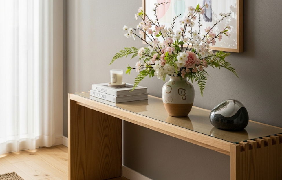 もし背景が雑多になりがちな場合は、アレンジメントの後ろにおしゃれなトレーやアートボードを一枚置くだけで、専用のディスプレイスペースが生まれます。
