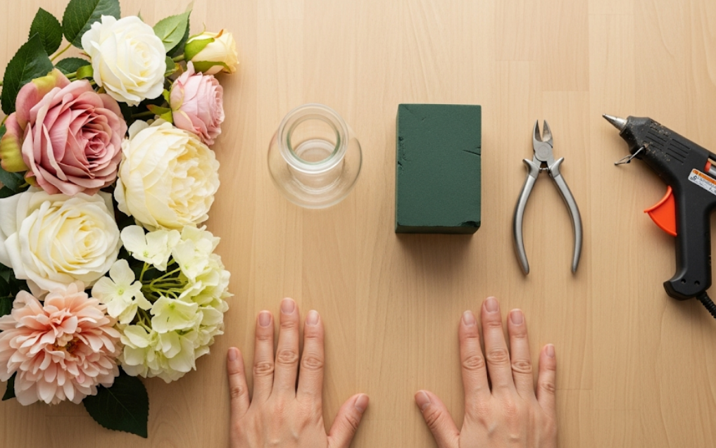 アーティフィシャルフラワーアレンジメントの魅力をご理解いただけたところで、次はいよいよ実践編です。