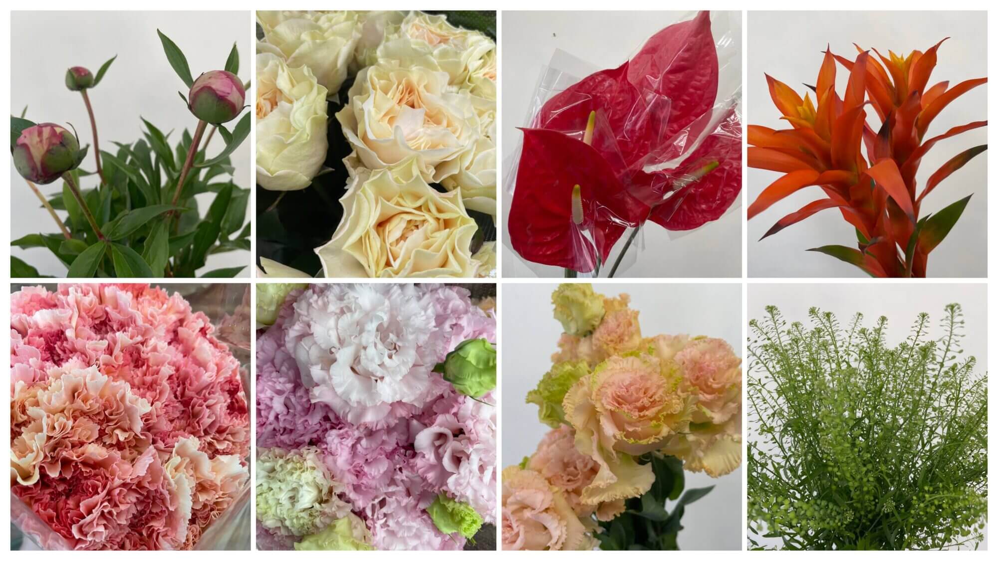 5月最初の切り花仕入れのお知らせです。上段左から芍薬(シャクヤク)、2番めはバラのクリームフレグランス、3番目はアンスリウムのトロピカル、最後はグズマニアです。下段の左の1番目はカーネーションのオーロラオレンジ、2番めはトルコキキョウのセレブクイーン、3番目もトルコキキョウでNFマンゴー、最後はタラスピ(ナズナ)です。今月8日は母の日ですのでだんだんと多くの注文も頂いています。