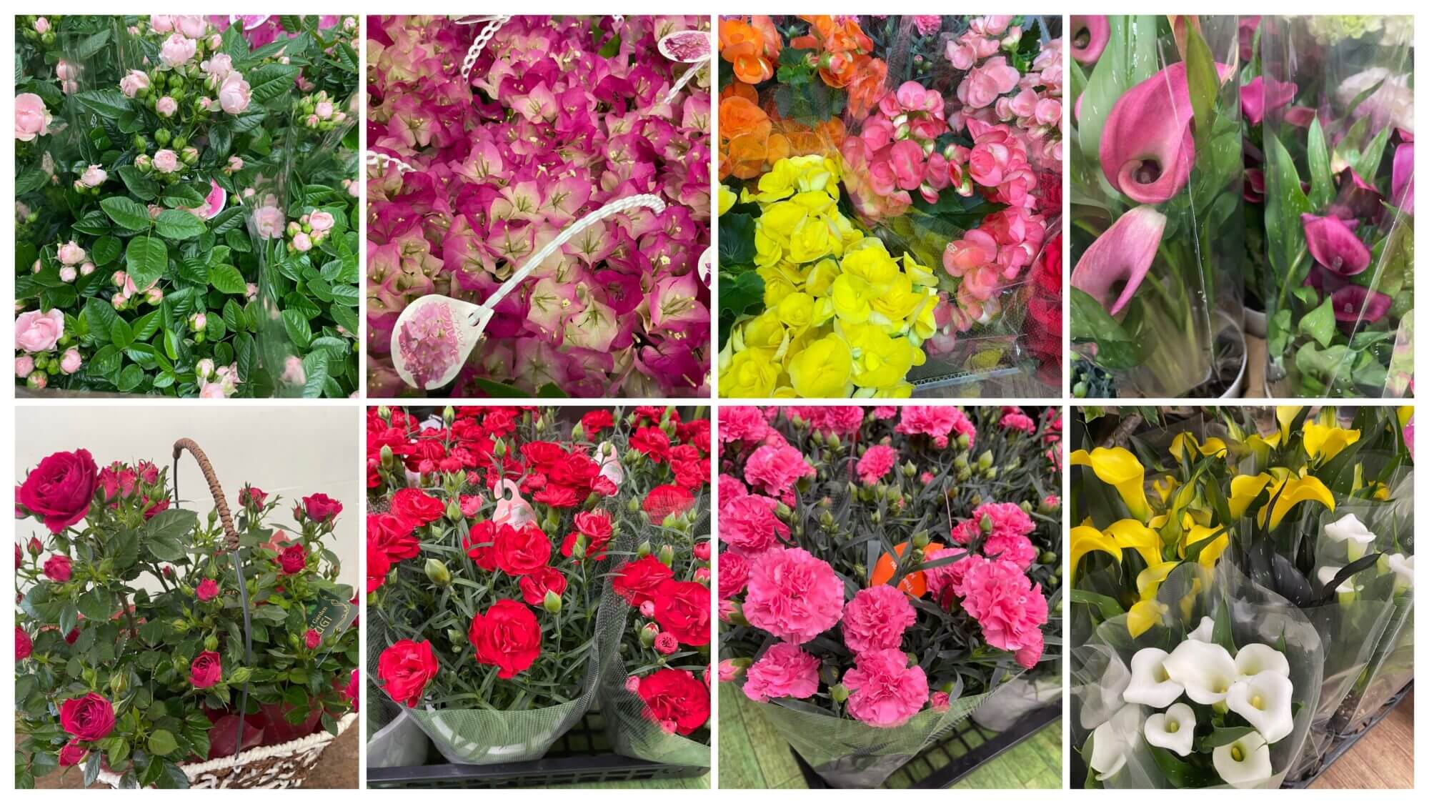 5月4日の鉢物入荷のお知らせです。8日の母の日に向けて仕入れています。上段左からバラのシルキーピンク。2番めはブーゲンビレアのピンクレディー。3番目はリーガルベコニア。上段最後はカラーです。下段の1番目はバラのボルドー。2番めはカーネーションのミアモーレ。3番目のピンクのカーネーションはクレア。最後はカラーが3色です。