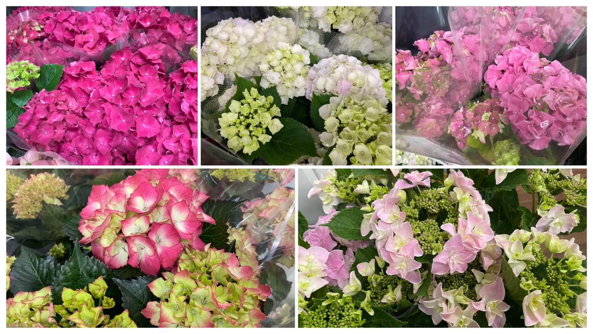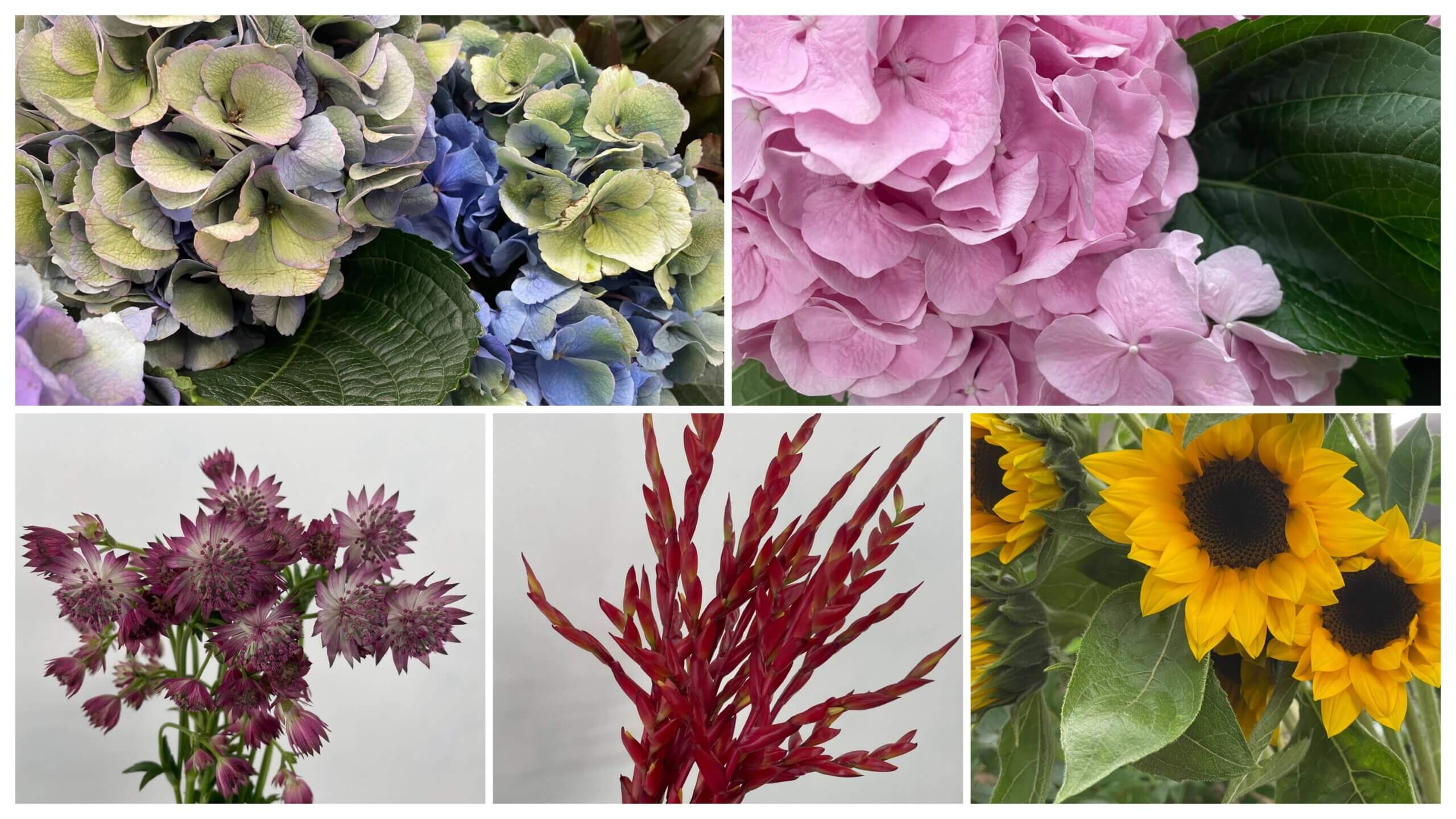 上段2つは紫陽花(ハイドランジア)で左のブルー系はOrion(Multi Purple)。輸入品のアジサイで品種名は箱に記載してあるままを書いてます。右も同じく輸入品で品種名はBelana(Light Pink)。下段の左はアストランティアのローマ。中央はグズマニアで箱への記載はVriesea Smash(フリーセア スマッシュブランチ)となっていますがよく分かりません。。右はヒマワリのサンリッチオレンジです。