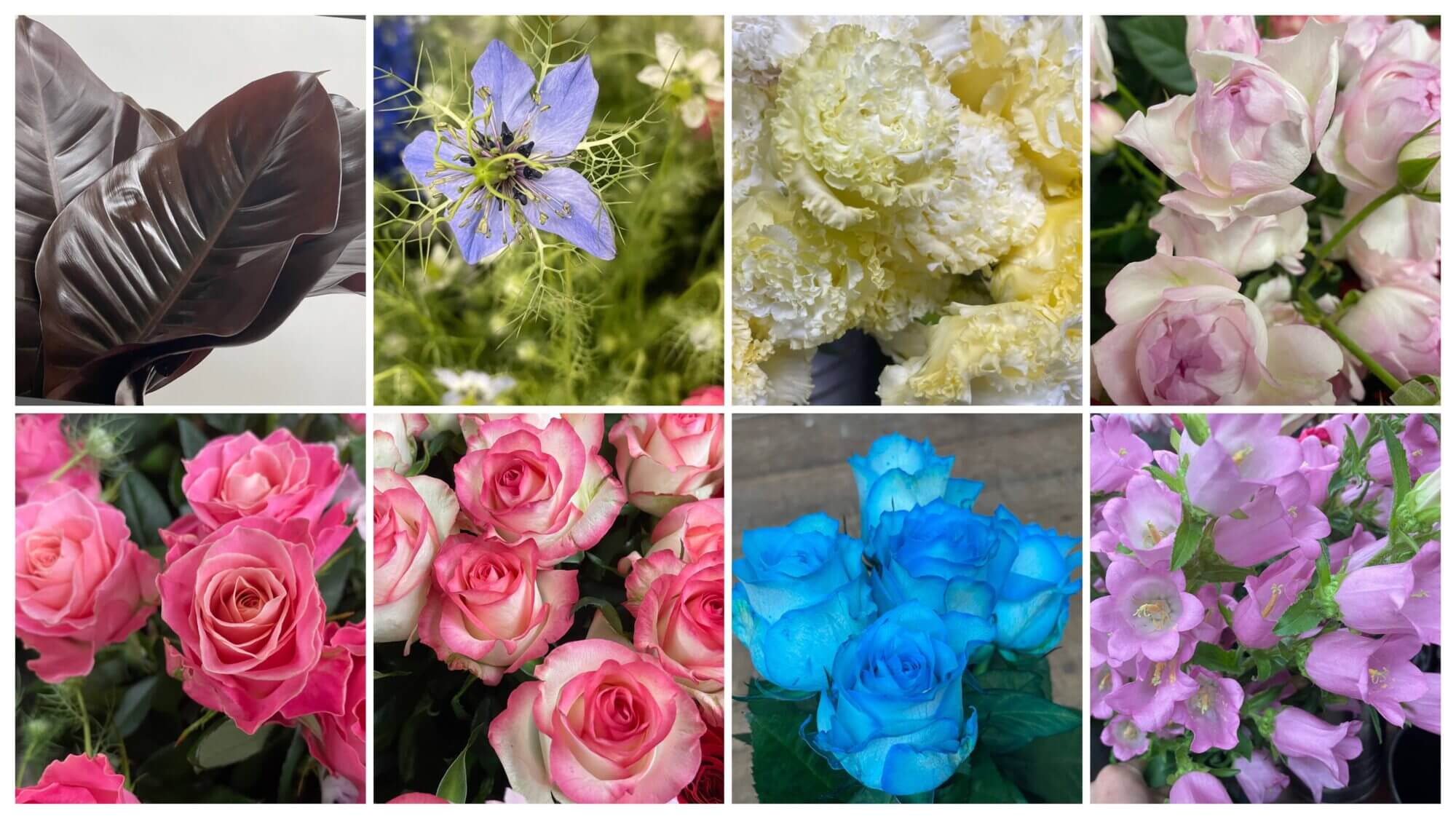 5月13日仕入れの切り花のお知らせです。上段左からフィロデンドロン ブラックコンゴという葉っぱ。水につけておけばびっくりするくらいすごく長持ちします。2番めはニゲラ。3番目はトルコキキョウのボヤージュイエロー。4番目はスプレーバラのシーアネモネ。下の段の最初はバラのアーリエス+。2番めのバラはジュミリア。3番目もバラですが青い色を人工的に吸い上げさせています。4番目はピンクのカンパニュラです。
