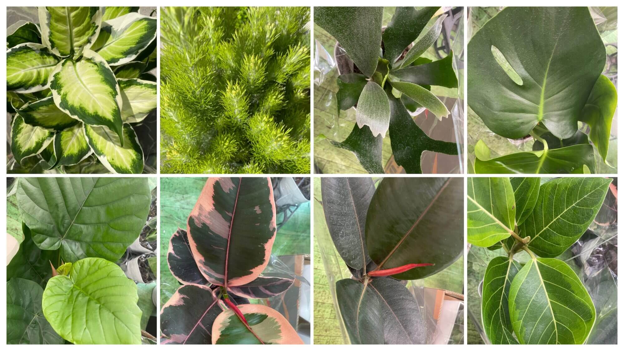 5月18日、鉢物入荷のお知らせです。まずは観葉植物各種です。上段左はディフェンバキアのクールビューティー。2番めはアデナンサス ウィーリーブッシュ。3番目はコウモリラン、4番目はモンステラ。下段の左はウンベラータ。2番めはフィカスルビー。3番目はフィカス・バーガンディ。4番目はフィカス・アルテシマです。次に花鉢です。