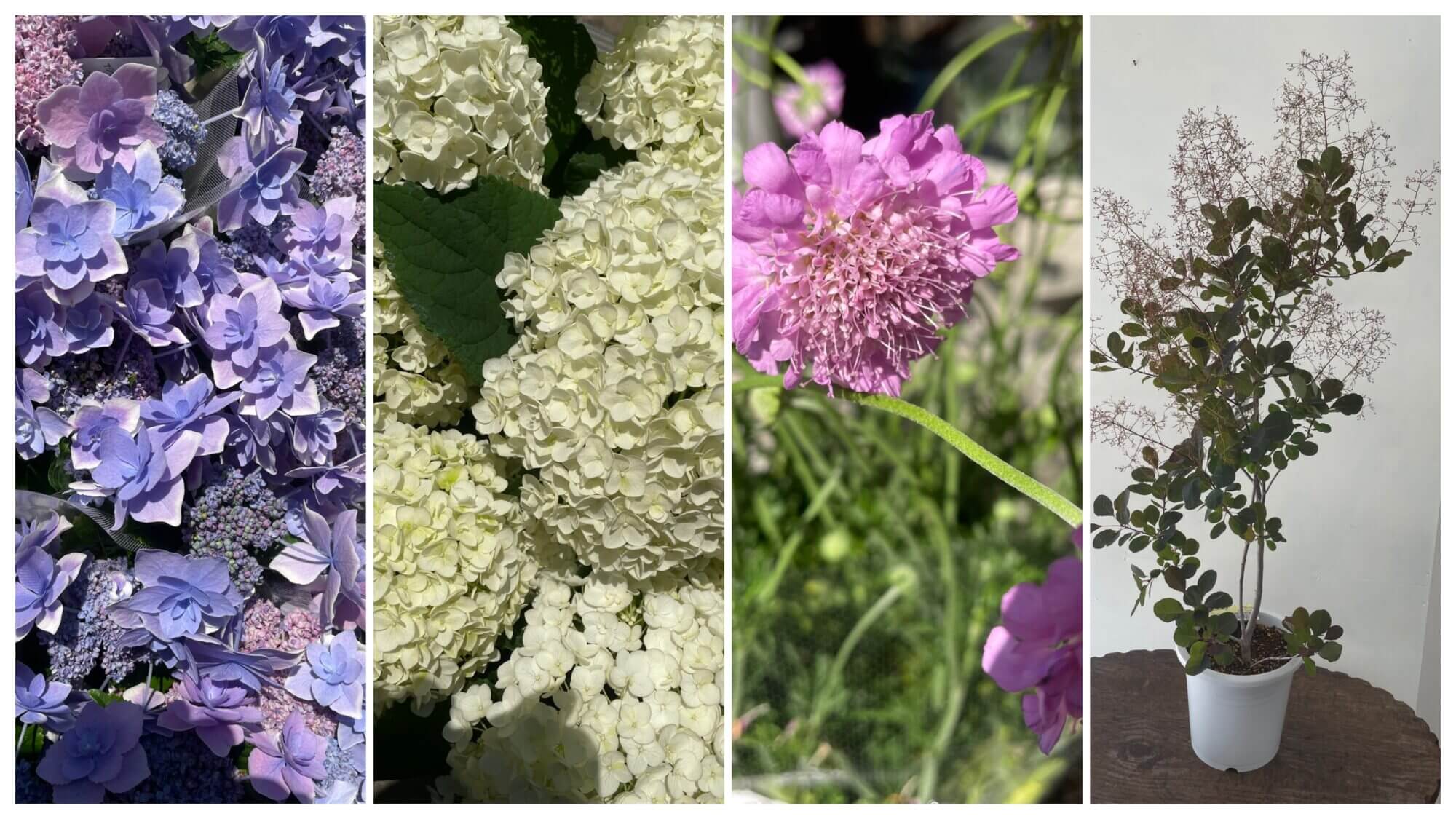 左から紫陽花のコンペイトウのブルー。2番めも紫陽花でアナベル。3番目はスカビオサのアメジストピンク。最後は花鉢ではないですがスモークツリーです。