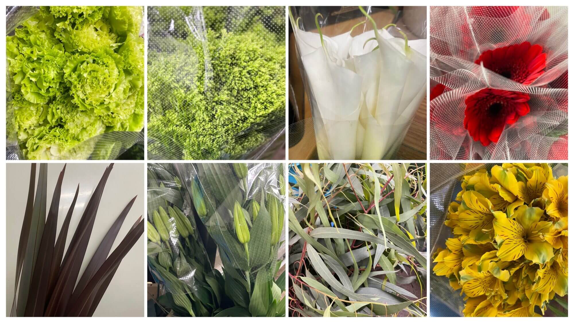 5月20日の切り花入荷のお知らせです。上段左からトルコキキョウのアンダーダブルモヒート。2番めは夕霧草のブリバグリーン。3番目はカラー。4番目はガーベラのスリ。下段左からマオラン。2番めはオリエンタル系ユリのシベリア。3番目は笹葉のユーカリ。最後はアルストロメリアのゴールドです。