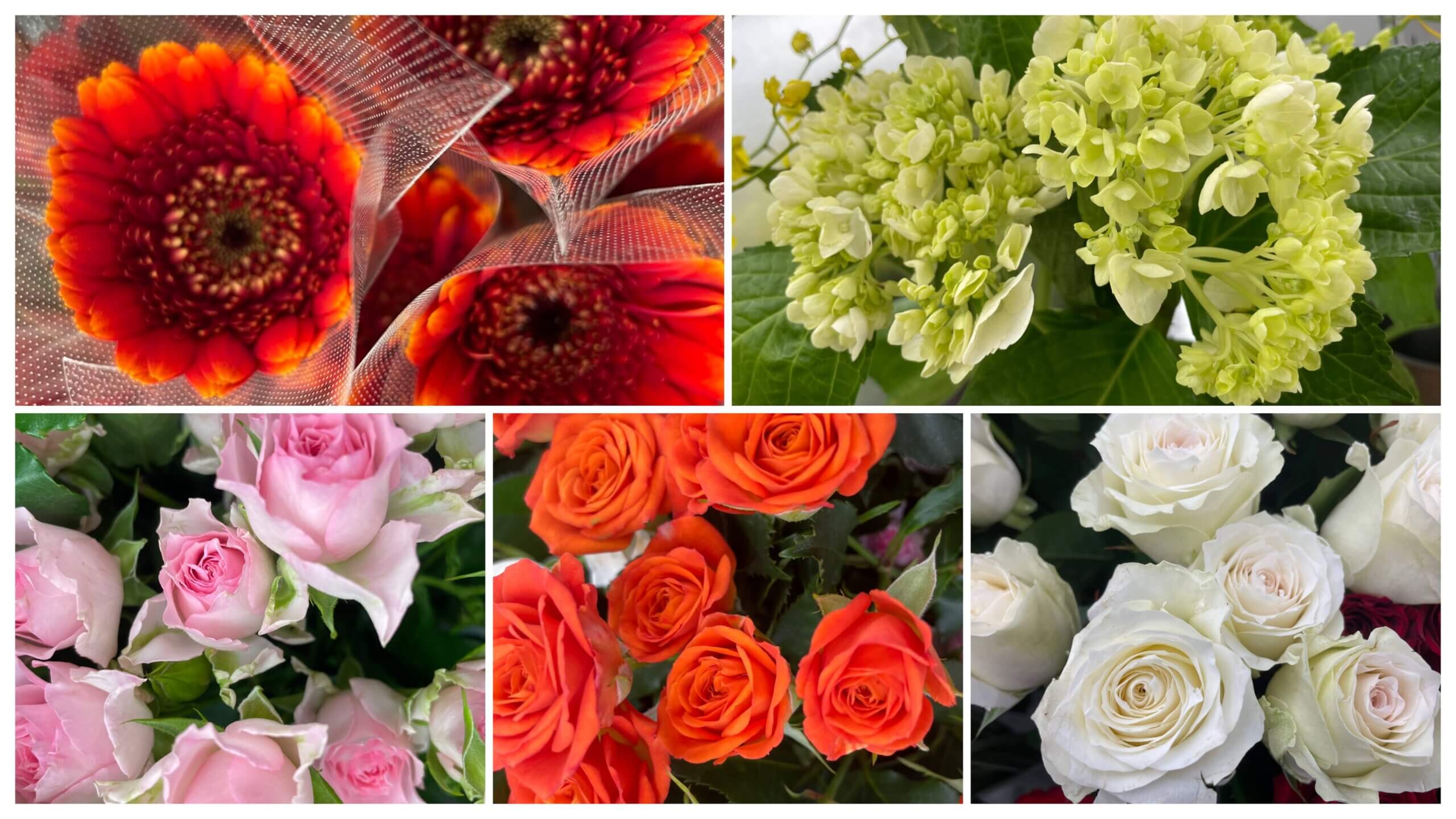 5月23日の切り花入荷のお知らせです。上段左はガーベラのブラッドレイ。右は紫陽花のミニグリーン。下段の左はスプレーバラのスウィートローラ。中央もスプレーバラでベイブ。右はバラのグランオマージュです。次にあと5つ紹介します。