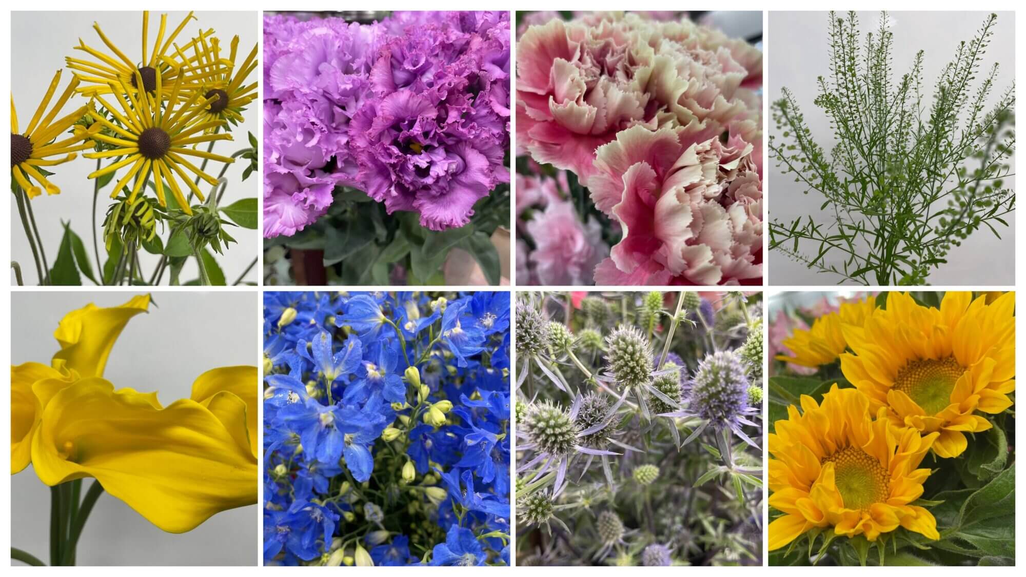 5月27日に入荷した切り花のお知らせです。上段左からルドベキア ヘンリーアイラーズ。2番めはトルコキキョウのジュリアスラベンダー。3番目はカーネーションのメルレットチェリー。4番目はタラスピ(ナズナ)です。下段左はカラー。2番めはデルフィニウムのスーパーグランブルー。3番目はエリンジウム。最後はヒマワリです。