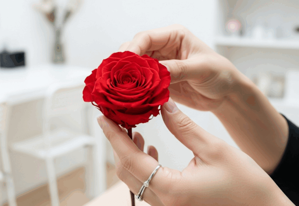 この「Preserved(保存された)」という名前の通り、生花の瑞々しさや柔らかな質感を保ちながら、長期間その美しさを楽しめるのが最大の特徴です。