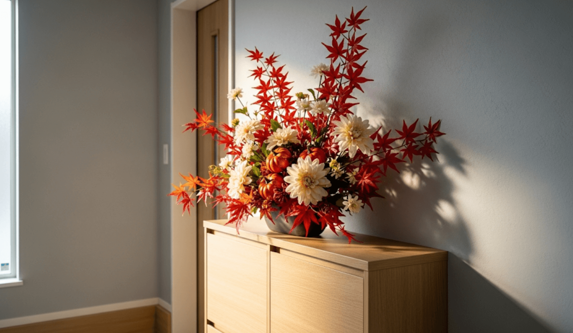 玄関への造花の飾り方を少し工夫するだけで、空間が驚くほどおしゃれに、そして華やかになりますよ。