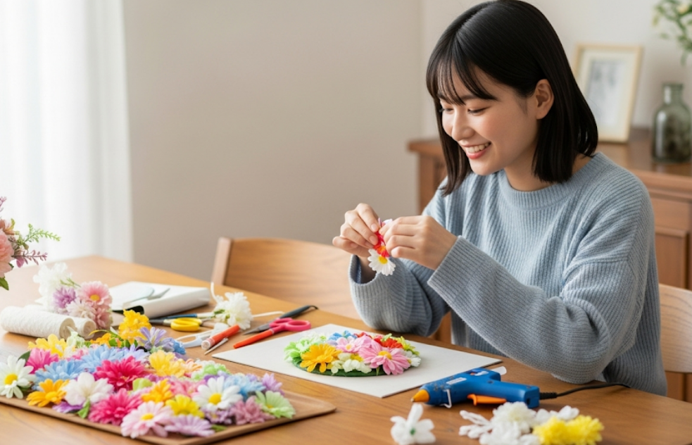 - リースやスワッグの材料として使う: リースやスワッグ(壁飾り)を手作りする際の材料として、100均の造花は最適です。グルーガンなどで固定していく過程で、多少の作りの甘さは気にならなくなります。季節のイベントごとに気軽に作り替えて楽しめるのも、低価格ならではの魅力です。