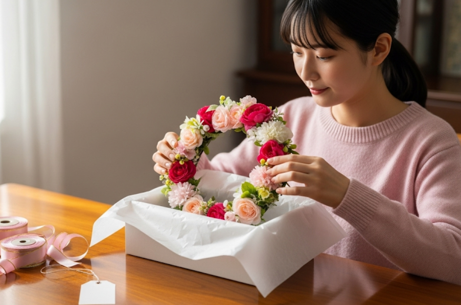 また、バッグの中でリースが傷つかないよう、薄紙などで軽く包んでから入れると、より丁寧な印象を与えます。